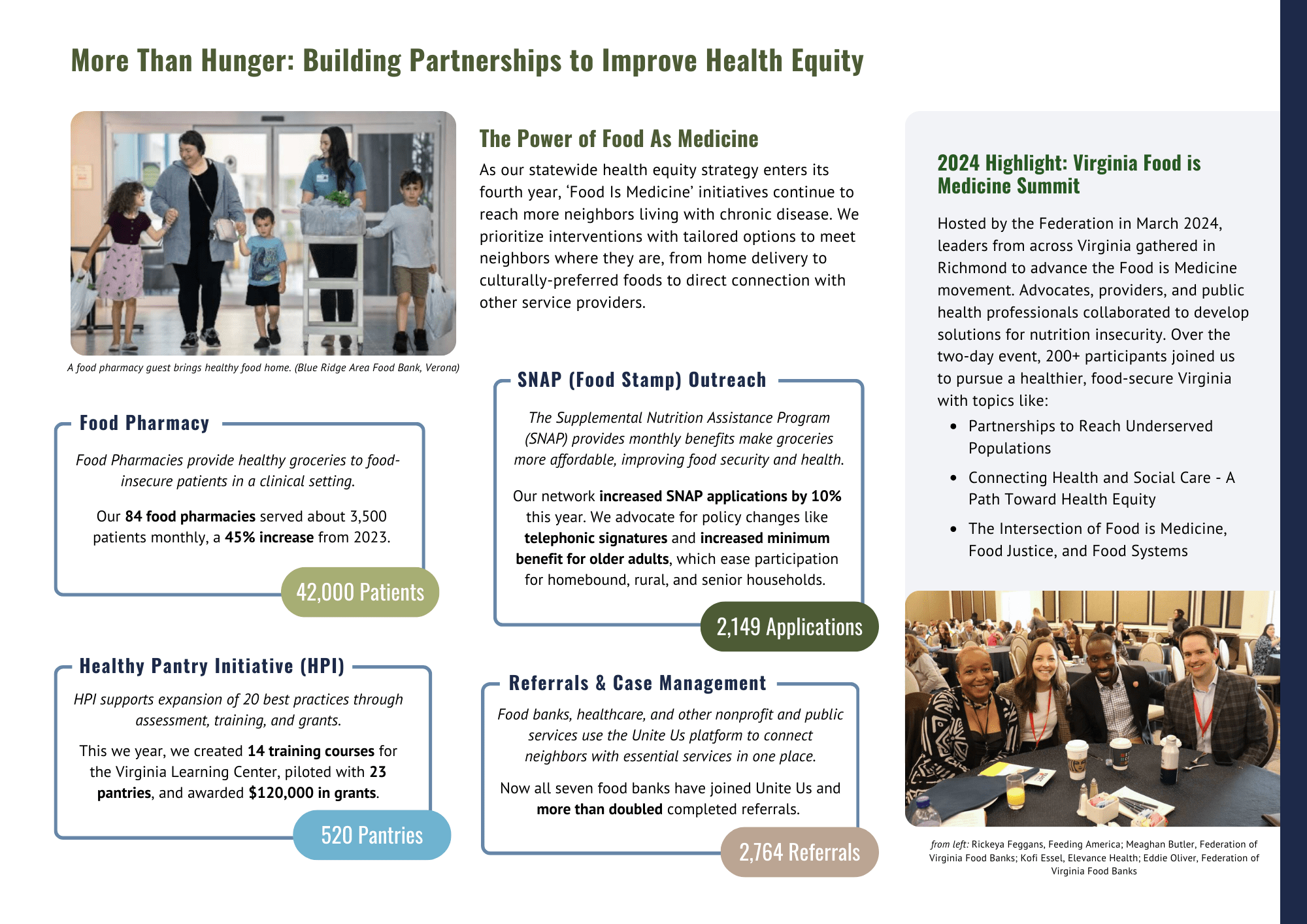 We are excited to share our 2024 Impact Report. This report offers a comprehensive overview of our achievements, strategic collaborations, and our unwavering commitment to creating a hunger-free Virginia. Thank you to our dedicated supporters and seven member food banks who have stood alongside us in our mission to combat hunger!